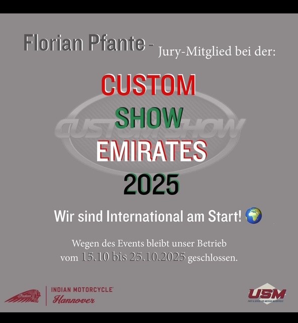 Florian ist Teil der Custom Show Emirates!! Daher ist unser Store vom 15.10.2025 – 25.10.2025 geschlossen!!!
